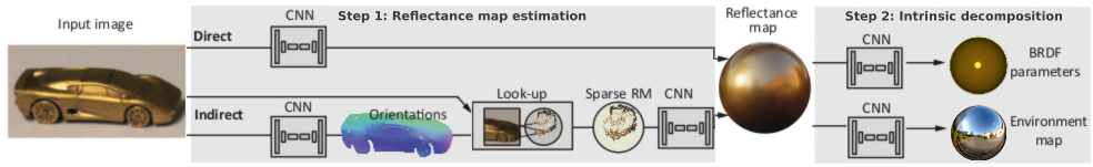 For the first step, we introduce a Convolutional Neural Network (CNN) that directly predicts a reflectance map from the input image itself, as well as an indirect scheme that uses additional supervision, first estimating surface orientation and afterwards inferring the reflectance map using a learning-based sparse data interpolation technique. For the second step, we suggest a CNN architecture to reconstruct both Phong reflectance parameters and high-resolution spherical illumination maps from the reflectance map. We also propose new datasets to train these CNNs. We demonstrate the effectiveness of our approach for both steps by extensive quantitative and qualitative evaluation in both synthetic and real data as well as through numerous applications, that show improvements over the state-of-the-art.